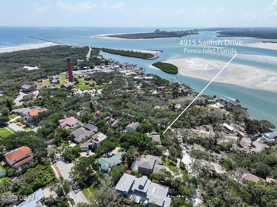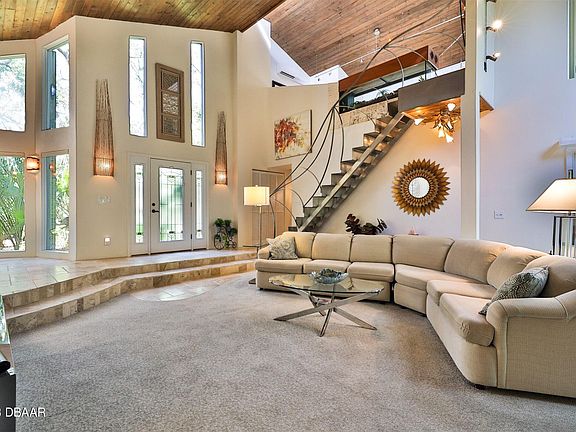Wow! A one of a kind beauty in Ponce Inlet across the street from the Lighthouse! This custom 3 /2 Turn Key Home on Scenic Sailfish Drive is being offered on the market for only the second time. Upon entering the home you see soaring ceilings with tongue and groove Spruce Wood, a Beautiful Custom Stone Fireplace imported from Tennessee , and a temperature controlled wine room. The timeless Travertine Floors are stunning, the custom brushed stainless staircase was fabricated on site and is truly a piece of art leading to the 3rd bedroom/office/loft. The loft has a built in aquarium in a custom teak surround ( currently being used as a terrarium). The upgrades in this home are so unique it really needs to be seen. The lighting is spectacular! Notice the hand blown glass chandelier & one of a kind pendants & sconces throughout the home. The primary bedroom has a heavy wooden door specially made from 150 yr old African hardwood.It's gorgeous! The Master Closet is 24' long, it's enormous! The kitchen is designed with Canadian Wavy Maplewood Cabinets , concealed SubZero Refrigerator & 2 Freezer Drawers, top of the line appliances include Miele Glass & Stainless Hood, Microwave drawer, Viking Wall Oven & a trash compactor. A very well thought out space showing the Delecatus Brazilian Granite which has amazing veining & colors - it really stands out with its custom chiseled edge. On the south side of the home there is a 2 car garage off the laundry room and the north side of the home has a custom air conditioned sports car / golf cart garage. Adjacent to this, there is a shady carport with attic storage above. 2015 Anderson Wind Rated Sliding Doors, built in Hurricane Shutters on all large glass panes as well. This home is impeccable & offered furnished with very few exceptions.