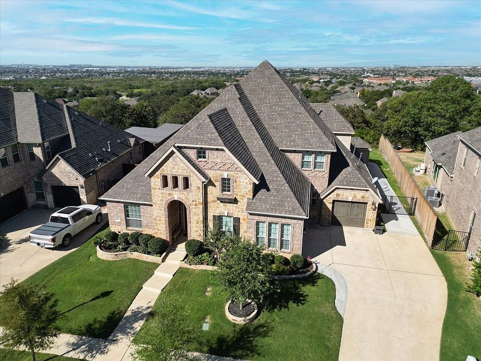 This 4 bedroom, 6 bath executive home in the Bluffs at Heritage Addition and in KELLER ISD sits high up and has a picturesque backdrop of gorgeous trees and breathtaking views.Welcoming entry leads to an open floor plan combining family room, dining room and kitchen. Family room features a modern chandelier from Williams Sonoma, stone gas fireplace and hand-scraped wood flooring. Culinary kitchen offers an oversized quartz island, abundant prep space, KitchenAid stainless appliances including gas range, ice machine, wine refrigerator and refrigerator. Owner's retreat includes with dual vanities, walk in shower, garden tub and massive walk-in closet customized by California Closets. All 4 bedrooms on first floor. Second floor features gameroom, media room, wet bar.Amazing outdoor space includes stone fireplace with 36 inch grill and sitting area; resort-style pool and spa overlooking wooded area with walking trails