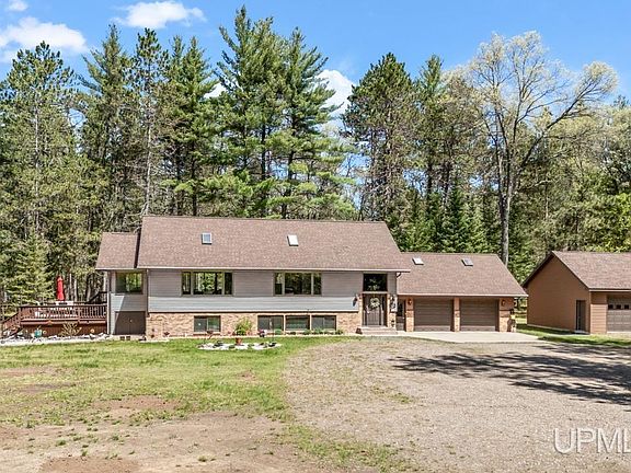 Solitude among whispering large pines, situated on 10 acres with over 660 ft of sandy Scout Lake frontage! If you want relaxation, wildlife and sounds of nature, this is the place - 24-acre Scout Lake offers excellent fishing, swimming and kayaking, too. This immaculate 4 bedroom, 2 bath home in a manicured setting offers a large open concept kitchen, dining, and living area with plenty of space for entertaining. From there, stroll out to the sun porch to sit or continue onto the deck and patio with a portable firepit. The insulated and heated attached garage includes a large second-floor bonus room for guests, as a den, rec room, or office. There's a second large detached garage that is also insulated for all your toys or extra vehicles. Updates abound here, including newer flooring, countertops, paint, appliances, 26x24 garage, well, roof, garage doors and openers, furnace, water softener, water heater, central air, plus remodeled baths and sunroom. This home is turnkey for you to move right in with your furnishings and enjoy! Down at the water is a very nice and level entertaining area, with another point well and roll-in dock. You can also enjoy direct access to ATV/snowmobile trails, thousands of acres of County and State land, and numerous other lakes and rivers. Covenents Apply