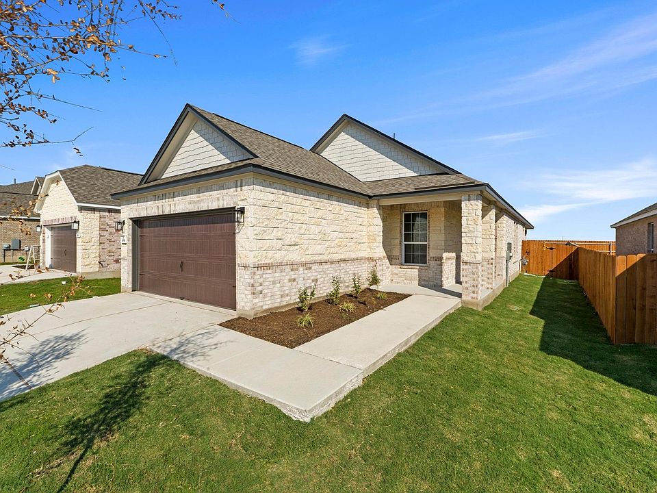 Don't miss out on this lovely, single-story home. Inside, discover an open floor plan with a spacious great room, luxury vinyl plank flooring throughout the living areas, and plush carpeting at bedrooms. Whip up culinary delights in the modern kitchen, which features flat-panel cabinets, granite countertops, tile backsplash and a gas range. The luxurious primary suite boasts a walk-in closet and connecting bath that offers a dual-sink vanity and walk-in shower with tile surround. Added touches include ceiling fans at great room and bedrooms, a smart thermostat, Sherwin-Williams® interior paint and modern Moen® fixtures throughout. Unwind after a long day on the covered back patio.