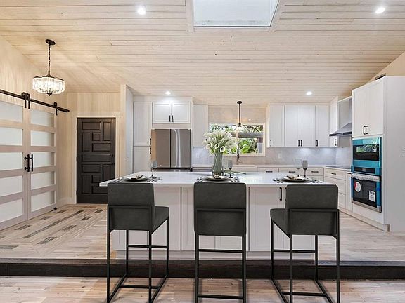One or more photo(s) has been virtually staged. Welcome to a one-of-a-kind, rebuilt residence nestled on a full acre in the highly desirable community of Hidden Oaks Estates. Rarely does a property of this caliber become available—offering the benefits of brand-new construction in an established, beautifully wooded neighborhood just minutes from everything. This 5-bedroom, 3-bathroom home has been meticulously transformed with top-of-the-line finishes and thoughtful craftsmanship throughout, creating a move-in ready haven for the most discerning buyer. From the moment you step inside, you’ll notice the quality and attention to detail that defines this home. The heart of the home is the all-new kitchen, featuring high-end appliances, custom cabinetry, quartz countertops, and designer fixtures, all opening seamlessly to the spacious great room—ideal for both entertaining and everyday living. Hickory wood flooring flows throughout every room, while distressed shiplap ceilings add warmth and charm. Every bathroom has been completely remodeled with luxury materials, stylish tilework, and modern finishes. Step outside to enjoy the Florida lifestyle on the newly built, expansive deck—just steps from the sparkling, refreshing pool with a paver brick surround, perfect for lounging and soaking up the sun. The outdoor living space is a true showstopper, featuring over 1,200 sq ft of outdoor living including a stylish pergola, built-in bench seating, comfortable outdoor furniture, and a cozy fire pit. And for the ultimate in al fresco entertaining, the outdoor kitchen is fully equipped with a built-in BBQ, beverage refrigerator, and pizza oven—perfect for hosting everything from casual family dinners to lively weekend gatherings. Whether you're relaxing in the sun, cooking up a feast, or enjoying quiet evenings in your private backyard oasis, this thoughtfully designed outdoor area blends comfort and style in a serene natural setting. With plenty of room to garden, play, or expand, the full acre lot offers a rare combination of privacy, versatility, and beauty. Additional highlights include a 3-year-old roof, 16 inches of insulation for superior energy efficiency, an electric pool heater, and a garage upgraded with waterproof laminate flooring, travertine, and cabinets. This home also offers a split floor plan ideal for multi-generational living, guests, or a home office setup. Outside, you’ll find yourself immersed in a private retreat surrounded by mature oaks and lush Florida landscaping, with plenty of space to play, garden, or simply unwind. Located in the charming, deed-restricted community of Hidden Oaks Estates, residents enjoy a peaceful, park-like atmosphere with mature trees, and architectural variety. A standout feature of the neighborhood is the community tennis court—providing a perfect space for friendly matches, active recreation, or simply enjoying the outdoors with neighbors. Hidden Oaks Estates is known for its large custom-built homes, tranquil setting, and unbeatable convenience—just ten minutes from downtown Sarasota, minutes to I-75, and close to beaches, parks, golf courses, schools, shopping, and restaurants. This is a rare opportunity to own a like-new home on a sprawling lot in one of Sarasota’s most beloved neighborhoods. The work has already been done—just move in and start living your best life. Furnishing covey with the home.