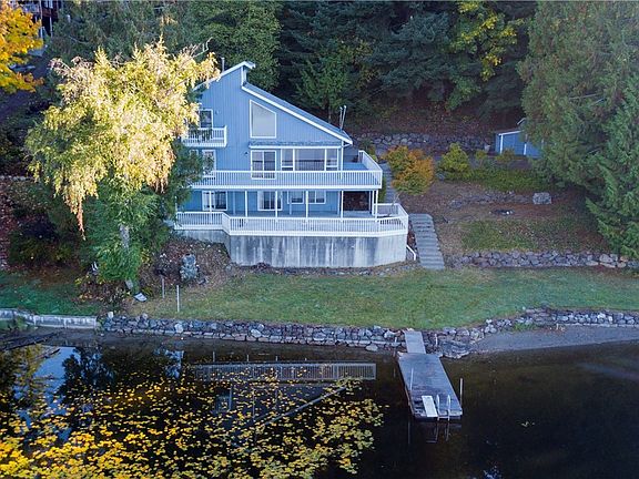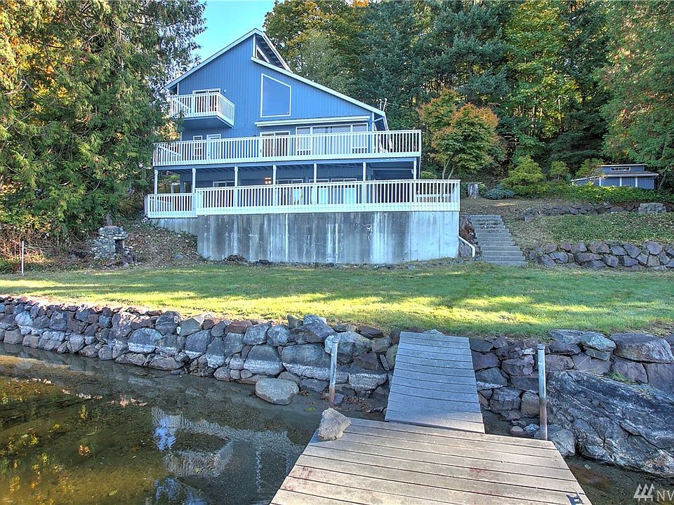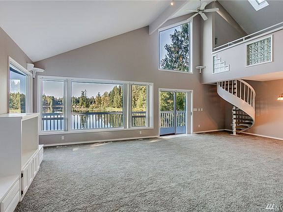 Walk in and you feel like you are walking on the Lake! Amazing west side views from almost every room. Great room w/vaulted ceilings plus full bath & laundry rm near by. Master bedroom has its own set of stairs to full bath, walk in closet & private balcony. Downstairs has bedroom & recreation room both w/sliders to the patio. Flex room could be office or den. Brand new carpet & paint in/out. Easy access to your own dock & beach. Get away from the stress! Live like your on vacation year around!!