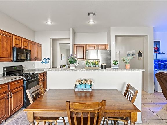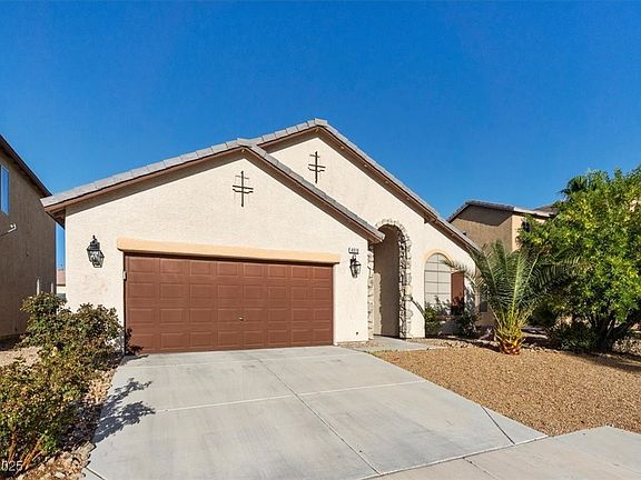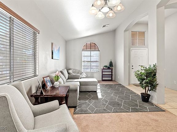Charming single story home in North Las Vegas featuring 3 bedrooms, 2 bathrooms, and a 2 car garage. The front family room leads into an open concept living room, dining area, and kitchen with a breakfast bar and ample cabinet space. Tile flooring throughout the main living area, with cozy carpeted bedrooms. The spacious primary suite includes a walk in closet and ensuite with double sinks, separate shower, and soaking tub. Enjoy a large backyard with desert landscaping and a covered patio that is perfect for outdoor relaxation.