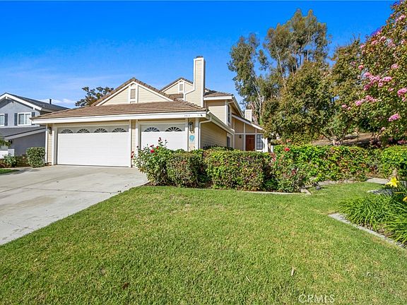Privately situated, 4 bedroom, 3 bathroom home located on a quiet cul-de-sac with views of the Foothills. When entering from the front door, you will see a spacious living room with vaulted ceilings and fireplace, dining area that continues into the kitchen boasting a breakfast area and a great view out to the lovely backyard. The kitchen is offering stainless steel range hood, cooktop, microwave and oven. Across the formal dining room, there's a second fireplace in the family room with direct access to the 3-car garage. 1 bedroom and 1 full bathroom downstairs. Upstairs the master bedroom possess a bathroom with a double sink, vanity, shower/tub and walk-in closet. Additionally, there are 2 bedrooms with a full hallway bath. From downstairs you can access the beautiful and private backyard. Other features include brand new vinyl flooring, central A /C and heating, mirrored closet, laundry area in garage and lovely floral landscaping in front yard.