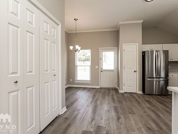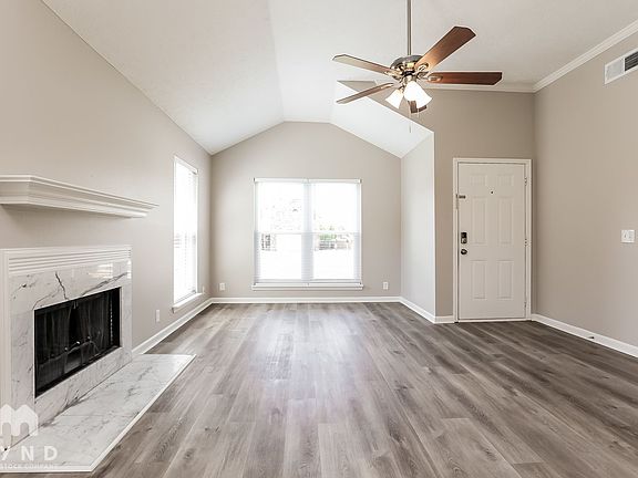 Welcome to a charming single-story home at 4917 Hickory Woods E, offering 1341 sq ft of comfortable living space. This residence features three bedrooms and two full bathrooms. The spacious living room is a focal point, boasting a vaulted ceiling and a cozy decorative fireplace, which flows seamlessly into the dining area. The well-appointed kitchen is equipped with a full suite of stainless steel appliances and features plenty of storage space. The primary bedroom is a peaceful retreat, complete with a walk-in closet and an attached full bathroom with dual sinks, a separate soaking tub, and a shower. Two additional bedrooms and a full bathroom complete the layout. This smart home is outfitted with a smart lock, thermostat, and hub, providing modern convenience and security. The property also includes a dedicated laundry area with washer/dryer hookups, an attached garage, and a covered front porch. Located near US-41 N and US-70S W, ensuring quick access to major roads and local amenities.