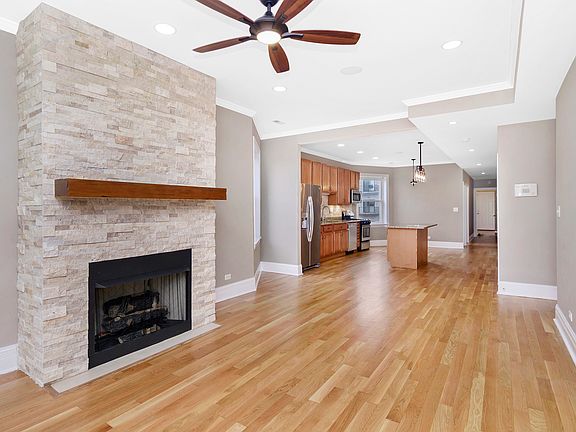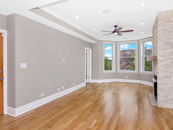 Recently remodeled, spacious, and gorgeous top floor unit in an intimate three-unit graystone building surrounded by newly constructed homes. Embrace luxury living with beautiful hardwood floors throughout, eye-catching travertine stone fireplace, spacious kitchen with 42in. maple cabinets, under counter lighting, stainless steel appliances, and tree top views from every window. New furnace and ac system, top-of-the-line stackable washer and dryer. Generous-sized bedrooms with a primary suite, Jacuzzi tub, double vanity, and large master walk-in closet, as well as a bonus room, perfect for an office or den. Relax at the end of the day on your private balcony and pull right in to your gated parking space. Walking distance to the train, lake and University of Chicago. Non refundable $975 move-in fee and first month's rent due at signing. MID TERM LEASES, CORPORATE HOUSING and TEMPORARY HOUSING all acceptable. Credit score 680+ income must be verified, prior landlord references preferred. Application fee $42 per person over 18. Evictions will disqualify.
