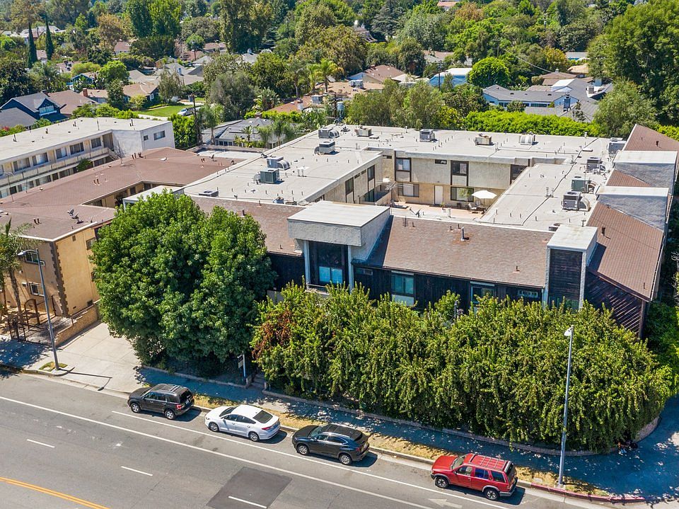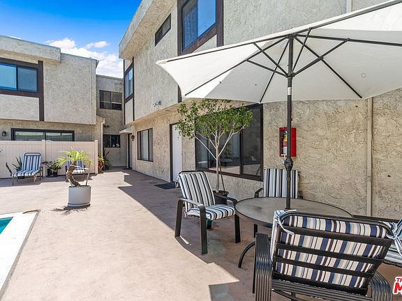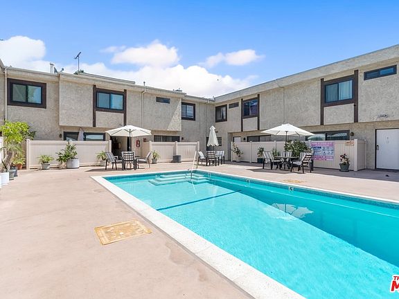 Best, brightest, 2 story townhouse unit in the complex with views of greenery and trees. Located at the back of building, away from the street. Streams of light throughout. Huge pool in sunny sundeck area, and 2 side by side parking bays, guest parking and extra storage in the garage. Newly painted with central air conditioning. Gas fireplace in the living room with large dining area. Eat-in kitchen opens to private patio with room for outdoor tables and chairs. Guest powder room downstairs with 2 bathrooms upstairs. Master suite upstairs, features dual vanities and two closets with views of trees. 2nd bedroom upstairs, overlooks the pool area. Laundry is located on the 2nd floor between the bedrooms. The building features a gated entry with intercom and security camera. Low HOA dues and close to Metro Bus Line, Studios, Coffee Shops, Menchies Frozen Yogurt, Restaurants, Gelson's, Starbucks and the 170 and 101 freeways.
