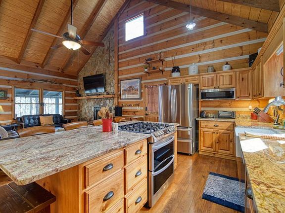 Welcome to your storybook log cabin in the heart of the Aska Adventure Area-where the forest is your neighbor, the river is your playground, and every corner feels touched with a little magic. Tucked away at the end of a quiet cul-de-sac and backed by USFS land, this cabin is as private as it is charming. And yes, it even comes with deeded access to the sparkling Toccoa River-because what's a mountain escape without a river to wander to? Step inside and let the warmth wrap around you. Cathedral ceilings soar above, rustic beams stretch across, and a grand stone fireplace promises crackling fires and cozy evenings. The kitchen is a delight, with granite countertops, a farmhouse sink, a center island, and not one but two pantries (because every fairytale cabin needs room for cookies and cocoa). The layout unfolds like chapters in a book: A main-level bedroom and bath for easy living. An upstairs loft with its own bedroom, bath, and a tucked-away office nook. A terrace level with two more bedrooms, a family/media room, and storage for all your adventures. But the magic truly sparkles outdoors: sip morning coffee on one of the two covered porches, linger over candlelit dinners beneath a chandelier on the deck, sway away your worries on the hanging swing, soak them in the jacuzzi next to the expansive forest or gather everyone around a fire pit that's big enough for the whole village (s'mores required). The fun doesn't stop there-the two-car garage has been reborn as a lively game room, and above it awaits a private 1BR/1BA suite with its own kitchen and a fireplace, the coziest perch for guests or in-laws. Even the carport has personality-it's the perfect rainy-day spot for hoops or cornhole. And here's the cherry on top: this gem comes fully furnished and move-in ready. Just bring your bags, your people, and your sense of wonder mountain life is waiting.