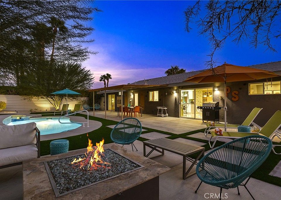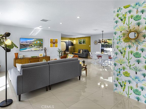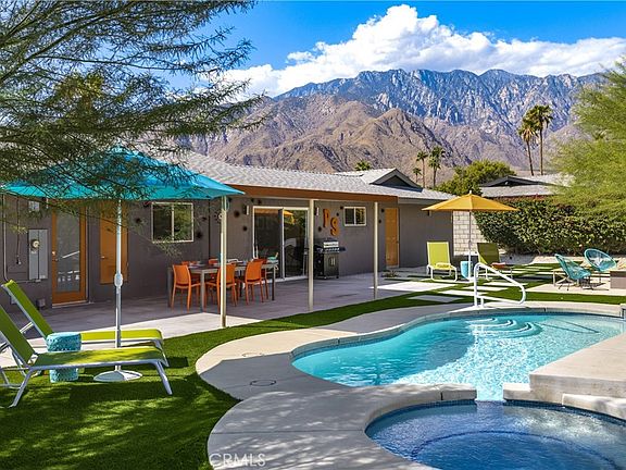This beautifully reimagined Mid-Century Alexander one of the few remaining “All Seasons” models perfectly blends iconic architectural charm with refined modern living. Thoughtfully updated inside and out, the home features an airy open concept layout with clean lines, newly painted interiors, white porcelain flooring, and a sleek contemporary kitchen. Large energy efficient windows and sliders flood the home with natural light while framing stunning unobstructed mountain views and creating a seamless connection to the outdoors. The home is being offered fully furnished with high end elegantly curated pieces, allowing buyers to move in and enjoy the space immediately. Recent upgrades include a new dishwasher, new washer, and a brand new whole home water leak detection system for added peace of mind and everyday convenience. Outdoor living feels like an extension of the interior, offering multiple areas to relax dine and entertain all set against the dramatic desert landscape. The backyard features low maintenance turf, a sparkling pool and spa, and additional enhancements including a new pool pump and updated pool and spa lighting. The property offers exceptional tranquility, a quiet neighborhood setting, and complete privacy with no neighboring homes intruding on the serene mountain backdrop. Ideally located just 5 minutes from Palm Springs’ renowned shopping dining and nightlife yet tucked away enough to enjoy peaceful desert ambiance, this home combines architectural integrity luxurious furnishings modern amenities and the effortless indoor outdoor lifestyle Palm Springs is known for. A truly turnkey desert retreat.
