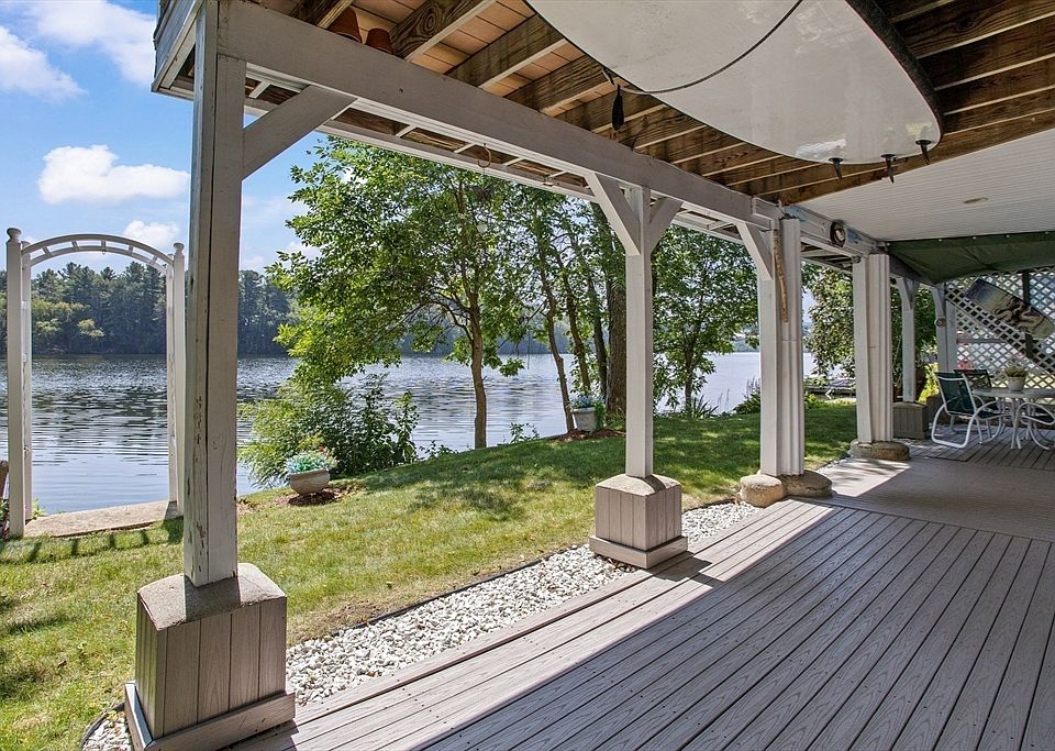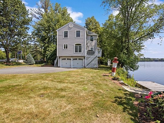 Beautiful Waterfront on the Merrimack River – Ideal Commute Location Off Route 93. This floor plan is designed to capture the river from every angle. The primary bedroom on the 1st floor features an en-suite bath and opens to a beautiful sunroom filled with natural light. The cathedral-ceiling living room opens to a dining area with sliders to the deck. The spacious island kitchen features ample cabinets, a pantry, and ample space to entertain. The second floor features two bedrooms, a den, and a full bath, with a catwalk. An oversized garage features an additional garage door that opens directly onto a waterfront, covered patio. Choose from three decks—front, back, and a lower-level covered space—to relax and take in the views. If you're looking for a lifestyle, welcome home. Every day feels like a vacation—boating at your doorstep, and the peaceful sound of the river. The property has a dock!!!