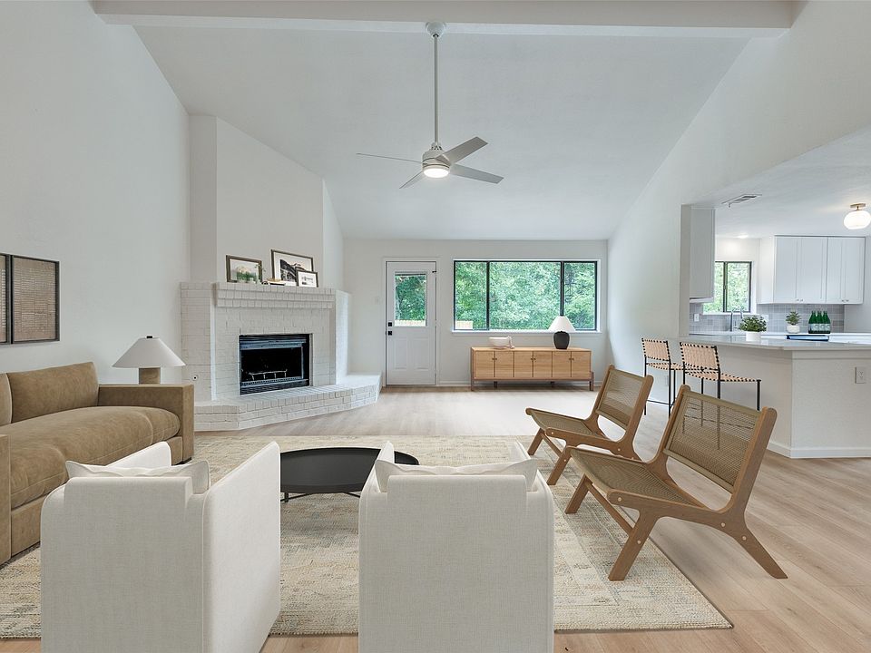 Charming home minutes from downtown Dallas reimagined by Maverick Design home offers 3 bedrooms, 2 baths, double car garage, large backyard and more. Upon entrance to this home, you will immediately notice the high ceilings, beautiful flooring, modern picked lighting, natural light, and corner fireplace. Open concept floor plan into the kitchen and dining area, the kitchen boasts stainless steel appliances, shaker style cabinets with brass hardware, bright crisp countertops, designer picked backsplash and pantry. The primary suite offers vaulted ceilings, walk in closet and is situated on the rear of the home. Enjoy your new primary bath that includes double vanity, walk in shower and an abundance of natural light. Two other bedrooms and bath that complete this home. The back patio leads to the fenced backyard, storage building, no neighbors behind you for added privacy. Seller is offering a new counter-depth refrigerator and concessions for competitive offers, inquire today.