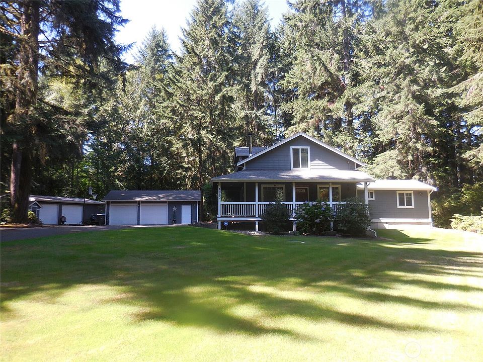 That special place to "hang your hat", just became "Live & Active" on the Kitsap County Market. This Beautiful Farmhouse with the wrap around, country covered front porch beckons your buyer's attention to detail. Having 2+ private timbered acres to roam makes it the perfect place to unwind & relax. With not only 1, but 2 Detached Garages Totaling 1848 Sq Ft under cover to collect or store whatever your heart desires. Entry to Living Rm & the central gathering point of the Kitchen w/ it's huge Island B-fast Bar. Stroll on thru to the Family Room and Vaulted Primary Bedroom & Ensuite w/French Doors to back yard. We have 2 full size Bedrooms & Full Bathroom up. The Southworth Ferry is only 3 minutes away, with Schools & Shopping very close
