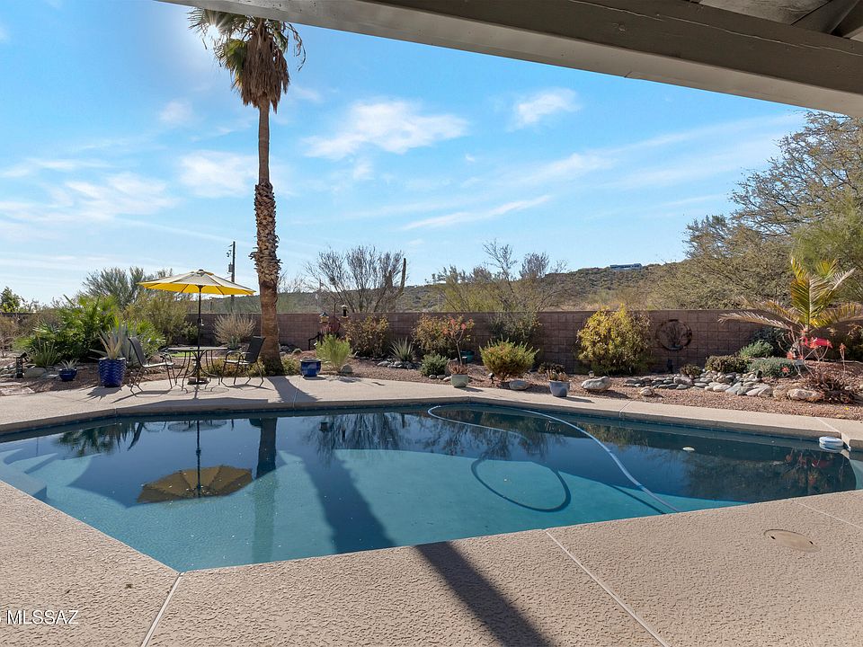 Sparkling poolOversized kitchenNew desert gardenDouble ovensBuilt-in beverage refrigeratorHuge island with seatingWalled-in backyard
