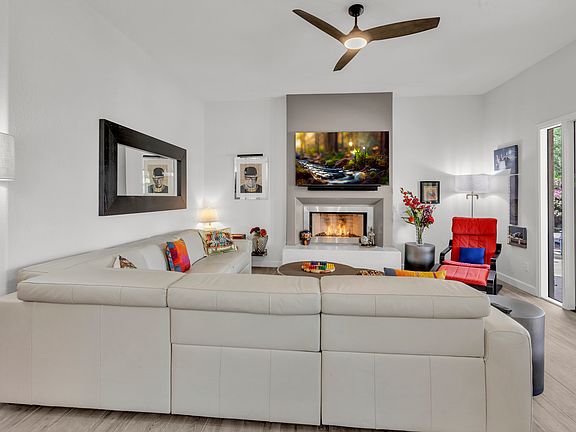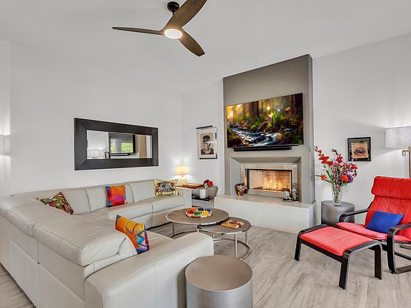 Resort-Inspired Backyard: Take a dip in the sparkling pool surrounded by lush, mature landscaping, blooming bougainvillea, and colorful cacti. Enjoy outdoor dining and lounge areas, a cozy fireplace for cool evenings, a putting green for golf lovers, and yard games for everyone.