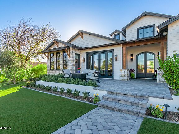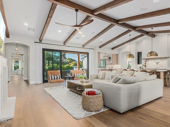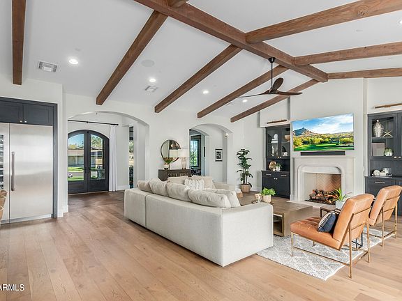 Exceptional residence, constructed in 2022, boasting 4,600 square feet of luxurious living space in the heart of Arcadia Proper. This stunning dwelling offers a unique double split floor plan comprising 5 en suite bedrooms. Additional features include a dedicated kid's playroom/bonus room, a cozy sitting room, and two well-appointed powder rooms. The kitchen is a chef's delight, equipped with two dishwashers, six burners, a spacious griddle, double ovens, built-in full-sized refrigerator, freezer, and wine storage. A bar area features an ice machine and under-counter beverage fridge, while a dedicated butler's pantry offers a full-sized sink, under-the-counter microwave, and a designated beverage refrigerator. The master suite exudes comfort with a fireplace, a generously sized bathroom featuring separate his/her vanities, a large soaking tub, and a walk-in closet complete with an island and ample storage. Throughout the home, high-end tile and custom cabinetry enhance the aesthetic, complemented by drapery and custom shades and total home water filtration system. Practicality meets luxury in the large laundry room, which houses an additional refrigerator, double washer and dryers, and a full-sized sink. The epoxied garages include a separate air-conditioned single-car garage, perfect for a hobby room or home gym. Designed for entertainment, the open floor plan seamlessly connects to the backyard, featuring a combination of artificial turf and grass, built in BBQ, spacious pool/jacuzzi, firepit, and beautiful landscaped surroundings.