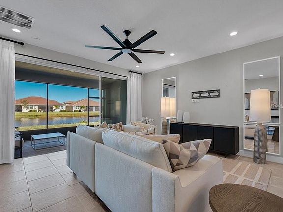 Located in Valencia del Sol, the most exciting 55+ resort-style community on Florida’s Gulf Coast, this beautifully partially furnished and decorated Columbia model offers a perfect blend of luxury, comfort, and carefree living. Designed with an open great-room layout, this home features 2 bedrooms, a den/3rd bedroom, 2 baths, and a 2-car garage, making it ideal for both relaxation and entertaining. The gourmet kitchen opens seamlessly to the dining area and spacious great room, flowing directly to the covered and screened lanai through triple 8-foot glass sliders that frame a stunning water view. Inside, you’ll find elegant 18x18 tile flooring laid in a waterfall offset pattern throughout the main living areas and den. The kitchen is a showstopper, boasting 42” Dove Maple cabinetry with crown molding and valance, soft-close dovetail drawers, under and over cabinet lighting, Silestone quartz countertops, a designer mosaic backsplash, and a counter-height extended bar top. Premium GE stainless steel appliances include a gas range, French door refrigerator, microwave, and built-in pantry. The spacious master suite features a coffered ceiling and two large walk-in closets, while the luxurious master bath includes a walk-in shower with decorative tile to the ceiling, quartz countertops, and comfort-height Dove cabinetry. The second bedroom also offers a walk-in closet, and the den/3rd bedroom features elegant double French doors. The laundry room is complete with upper cabinets and GE washer and gas dryer. Loaded with upgrades and set in a vibrant, active community that offers resort-style amenities, endless activities, and a friendly neighborhood atmosphere, this exceptional home redefines 55+ luxury living in Tampa Bay.