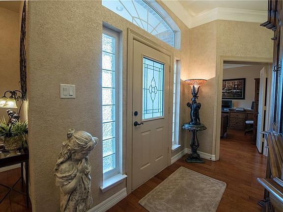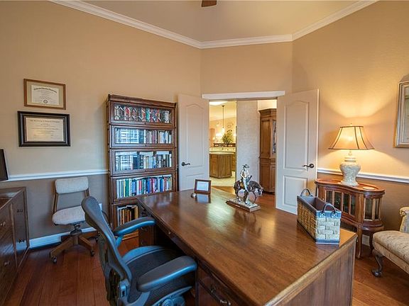 Prestigious home in gated community. Upon entry notice the striking Hand Scraped Hardwoods. Great living area with its well appointed Austin stone gas fireplace is perfect for ambiance. Inviting gourmet kitchen with Staron countertops, tumbled marble backsplash, SS appliances, convection oven, over & under cabinet lighting, undermount sink, island & eating bar. Split bedrooms. Study can be formal dining. Guest bath: premium granite, undermount sink. Large master suite zoned separately for AC & Heat. En Suite bath includes premium granite, large standalone shower, double vanities, & multi jetted tub. Alluring solar heated saltwater pool with fountains. Private & pristine yard, lawn service included in HOA.