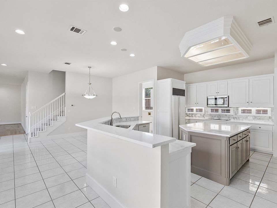 The remodeled kitchen is a chef’s dream, w updated cabinetry, built-in refrigerator, large prep island, & quartz countertops (2025) paired w a designer backsplash. Breakfast area flows seamlessly into the family room—ideal for hosting & everyday living. Upstairs, a spacious game room w built-ins & a second wet bar expands entertainment potential.