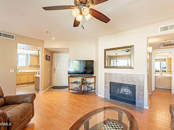 Welcome to this beautifully maintained 2-bedroom, 2-bath condo in a gated community with an unbeatable Scottsdale location! Just steps away from top restaurants and shopping, and only 1 mile from the exciting new PV project featuring Whole Foods, Flower Child, Costco, Lifetime Fitness, Trevors, and more. This light and bright unit offers an open floor plan that's perfect for entertaining, with a spacious living area that flows seamlessly into the dining and kitchen spaces. Relax by the cozy fireplace in the living room, creating the perfect spot for unwinding.