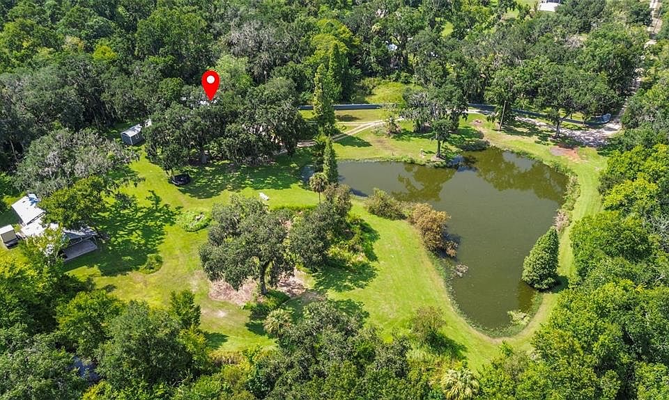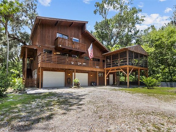 Just 35 minutes from Tampa, down a quiet drive and behind a private gate, awaits a rare and remarkable retreat: 10.1 secluded acres with no HOA, a fully stocked pond, creek, and wildlife - all wrapped around a lovingly maintained, one-of-a-kind custom home. And yes, it even comes with its own ATV and trailer included with the sale. Built in 1982 and owned by two families, this peaceful property welcomes you with the warmth of a well-loved home and the magic of true Florida nature. Grab your fishing pole and head out to the pond, where tilapia and bass await. Wade through the gentle creek that winds behind the home, or blaze your own trails beyond it - on foot or ATV. With man-made berms along the rear boundary, wide-open fields, and towering trees, the land itself invites you to slow down, breathe deep, and start living. The home rises across three levels, beginning with a ground floor that includes garage space, a carport, and ample storage. The main living area sits on the second floor, where the kitchen, dining, living, and family room flow together with large windows and doors opening to panoramic views. A bedroom with its own bathroom and an additional guest bath make this level ideal for everyday living or multigenerational needs. In 2009, a spacious suite and bath were added to this level (not yet reflected in public records), enhancing comfort and privacy. Upstairs, you'll find three more bedrooms - including the serene primary retreat with its own private balcony and treetop views, along with one shared bathroom. Throughout the second and third floors, vaulted ceilings, exposed wood beams, and new vinyl plank flooring give the home a fresh yet rustic charm. Step outside to the screened-in sitting room or one of two open-air balconies to watch wild life by - and, on rare days, perhaps even a Florida panther. The elevator lift, located next to the carport, provides added ease between two levels. Recent updates totaling over $50,000 include new electrical mains ran, EV charger, outlets and switches, interior paint, ceiling fans, light fixtures, custom blinds, hardware, and both garage and exterior doors + a whole-house water softener and filtration system with reverse osmosis in the kitchen ensures clean, safe water at every tap. Outside, the property continues to shine with a metal roof, three sheds, and a 50-amp RV hookup. The crown jewel? A huge, custom-built pole barn with full electric - perfect for events, weddings, gatherings, RV storage, or your next big project. And for electric vehicle owners, an EV charger is already installed (Tesla charger negotiable, wiring remains). From hosting friends under the stars to wandering the woods in total quiet, this home is more than a place - it’s a feeling. Private. Peaceful. Free. Yet somehow still just a short drive from city life, shopping, dining, and beaches. Acreage like this, with updates, charm, and soul - so perfectly nestled between Tampa and Orlando - is truly a rare find. Come get your slice of paradise and make it yours - however you want!