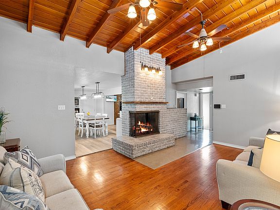 Step inside to the soaring vaulted ceilings adorned with rich, exposed beams that instantly impress and open up the room. The spacious living room is anchored by a stunning floor to ceiling fireplace and bathed in natural light thanks to the clerestory windows that offer privacy while inviting in the outdoors.