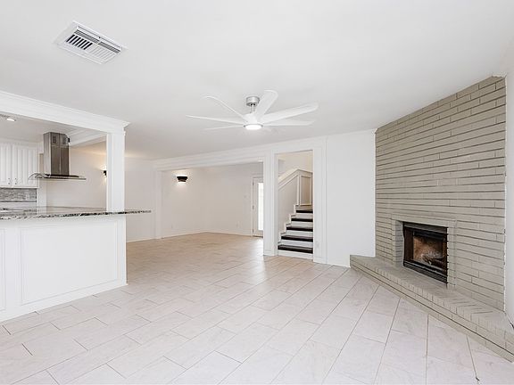 Wood burning fireplaceLarge backyard with patioNeutral colors