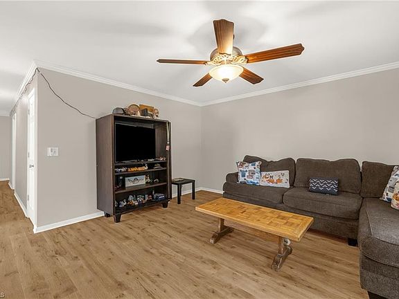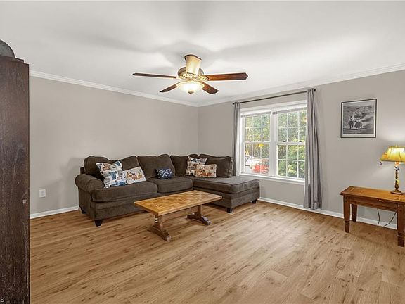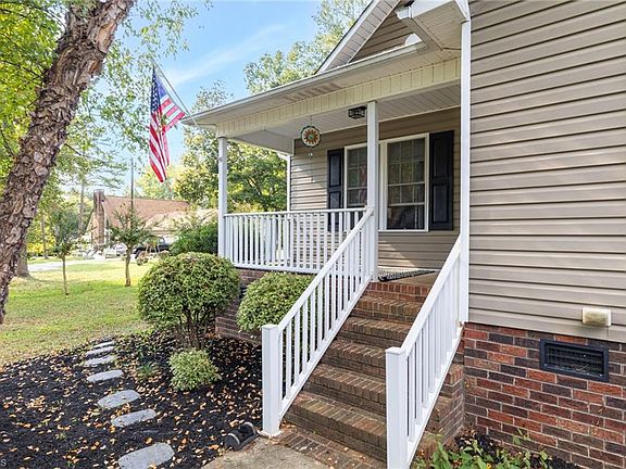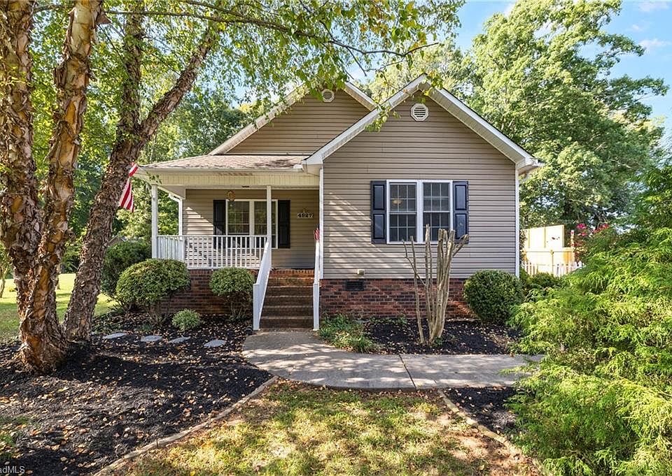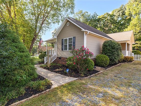 Single-level home featuring 2 bedrooms, office/flex space, and 2 full baths. Inviting front porch and bright eat-in kitchen with custom cabinetry and included side-by-side refrigerator. The primary suite offers an ensuite bath with double sinks, walk-in shower, and direct access to the backyard deck. Interior details include smooth ceilings and crown molding. Recent improvements include engineered hardwood floors (2025), newer heat pump (2022), and hot water heater (2025). Backyard highlights a refreshed deck (2025), 8x12 storage shed, and picket fence (2025)—perfect for outdoor living and storage. Convenient Triad location with quick access to I-74 & I-73, ideal for commuters. Located in an eligible area for 100% USDA financing. Move-in ready and thoughtfully maintained!