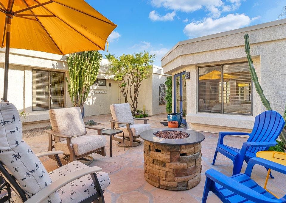 The kitchen is fully upgraded with state of the art appliances and is stocked with all cooking essentials for an extended stay. Open the large windows in the living room or dine outside on the large private patio overlooking beautiful golf course views with an magnificant mountain backdrop. The courtyard separates the main home from the casita and has another functional outdoor living space and outdoor BBQ. The private detached casita has a King bed and additional full bathroom, perfect for guests!