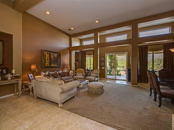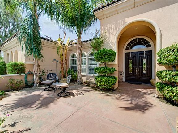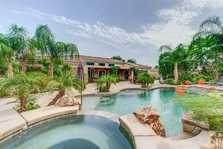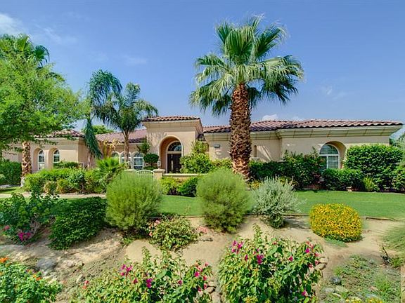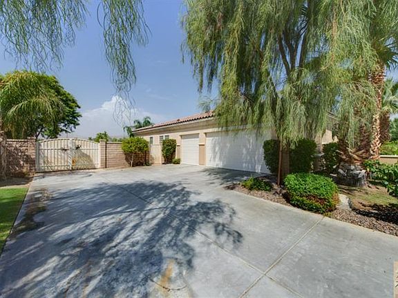 *** Reduced *** This amazing Plan II has nearly 3,500 square feet, 4 bedrooms, 3.5 bathrooms, a den and an oversized front courtyard. Situated on a half an acre of lush landscaping this beautiful home is located in the gated community of Desert River Estates. The gourmet kitchen with rich wood cabinetry, granite counters and stainless steel appliances is adjacent to a large Great Room with fireplace. The formal living area is centrally located and can be used as a multi-functional space. A Master Suite with gorgeous views and a spacious Master Bath with travertine counters and shower and complete with a large walk-in closet. One of the features that is the most attractive about this home is the incredible rear yard. The sparkling pebble-tec pool and spa are surrounded with tiered patio areas, a firepit, and a covered lanai area are all perfect for an outdoor living experience to take in the breath taking Santa Rosa Mountain views. Do not miss this buyer's opportunity.