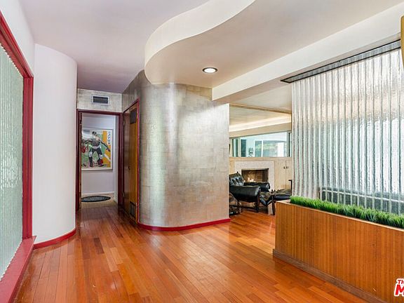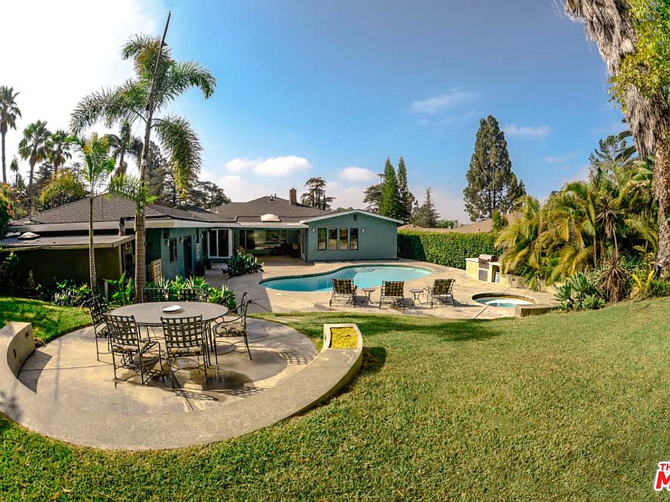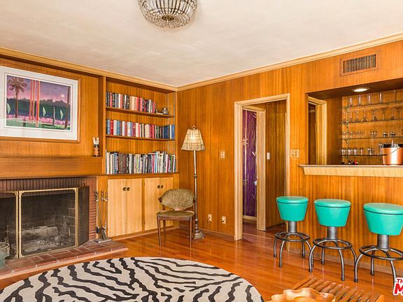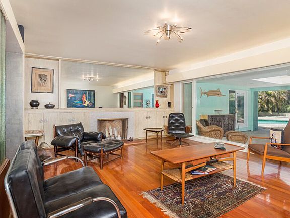 Exquisite Mid-Century, celebrity photographer's home. Entertainer's paradise on a huge (15,600 sq ft) corner lot! Hidden behind palms & succulents sits a "Mad Men" era single level jewel, reimagined for today's comforts. Many period details include ripple glass, and fab built in shelving, curved ceilings and curved walls. Stunning hardwood, Bolivian Rosewood in most rooms. Original ribbon cut mahogany bar, den with fireplace. Original wet bar from 1951 with atomic ice crusher and sink. Large picture windows viewing lanai and back yard oasis, salt water pool with Italian glass tiles. Redone eat-in kitchen with green slate floors and top appliances. Organic garden with citrus & avocado trees & drip irrigation system. Guest quarters w/separate entrance views out to salt water lagoon pool, grassy yard with bamboo privacy wall & built in BBQ. Can you hear the martini glasses clinking?