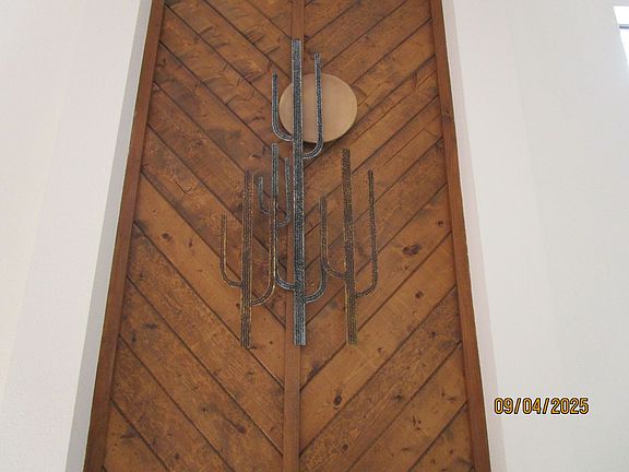 Enclosed courtyardWasher and dryer closetSculpture art decorationLots of cabinetsFront landscaped areaStone tile floorsWood blinds