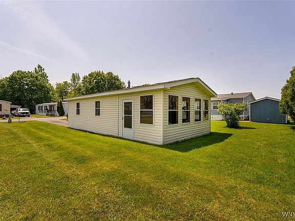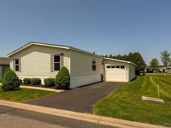 This 2002 Aurora Double-wide manufactured home is the pinnacle of The Village living. 1456 sq ft of open floor plan anchored by large kitchen with white oak cabinetry. 3 bedrooms including spacious Primary suite w/ walk in closet and the first of 2 full baths. Large windows throughout paired with multiple skylights provide an abundance of natural light. Hedgerow at rear of property provides additional privacy for the three seasons room. Attached garage and new roof (2024). Conveniently located near restaurants, shops, bus lines and all that Transit Rd offers. All that's left to do is move in!