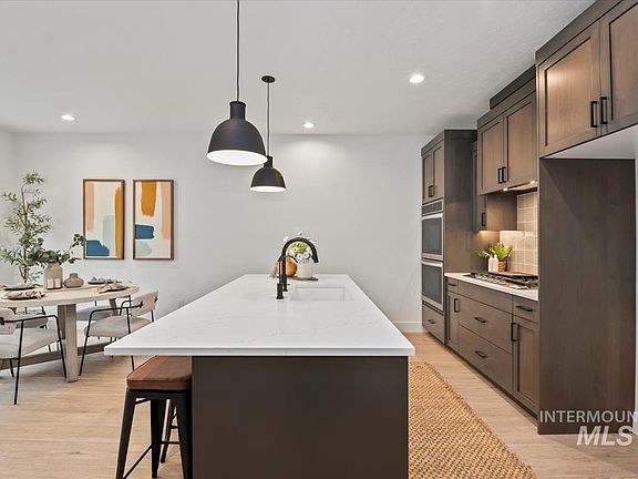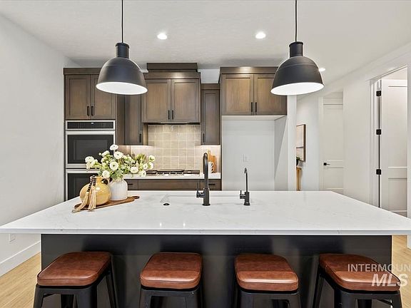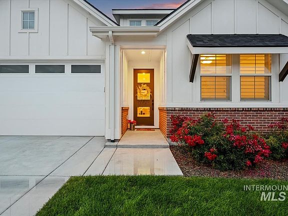 This beautifully designed 3 bed, 3 bath Sterling Homes residence in the heart of Eagle features an open and efficient floor plan with everyday living on the main level, including two bedrooms, two full baths, and an inviting great room that flows seamlessly into the kitchen with quartz countertops, stainless steel appliances, and soft-close cabinetry. Upstairs, a private suite with its own bath offers the perfect retreat for guests, in-laws, or a home office. Step outside to a covered patio and fenced yard ideal for relaxing or entertaining. Located in the highly rated West Ada School District, this home is close to Seven Oaks Elementary, Eagle Middle, and Eagle High. Enjoy nearby walking paths, the Boise River Greenbelt, Eagle Island State Park, and the renowned Eagle Hills Golf Course, where you can play a round, dine with friends, or take in stunning views. With modern comfort and access to top schools, trails, golf, and dining, this home delivers the best of Eagle living.