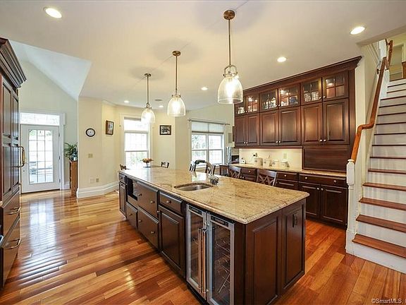 Welcome to this stunning, custom-built colonial which features extensive millwork and Brazilian hardwood floors throughout. Enter the dramatic, two-story foyer with coffered ceiling, to the formal living room and dining room, both with crown molding and indirect lighting, the family room also with a two-story coffered ceiling and a gas fireplace. The gorgeous kitchen with an abundance of cherry cabinets has a large island, granite countertops, a gas cooktop, 2 ovens, 2 sinks, subzero fridge, a separate wine fridge and a spacious, light filled dining area. Also on this level are a mudroom and a first floor guest room currently being used as an office. With a choice of 2 stairways, the second floor has 2 additional guestrooms, the laundry room, and a primary suite with double door entry. The en suite bath with double sinks, whirlpool tub, shower and a walk-in closet make this a private retreat. This home also has an almost 1000 sqft of finished living space in the lower level including a wine cellar with space for 1000 bottles! In addition to the attached, heated 3 car garage, there is a detached 1 car garage with heated office space. Conveniently located to Rt 2 and all that Glastonbury has to offer.
