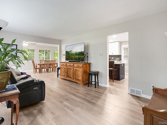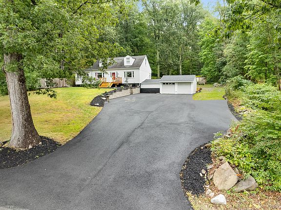 Tastefully updated and charming 3-bedroom Cape situated on almost an acre an a half on the border of Wallkill and Plattekill! This home features an open, sun-filled layout with luxury vinyl plank flooring throughout, large kitchen with white shaker cabinets, quartz countertops, a center island that fits 3 stools and SS appliances. Flowing into the dining area, which features a wood-burning stove and slider egress to the back deck with awning and level usable yard—perfect for entertaining and plenty of room for a pool! The first floor includes the spacious primary bedroom, laundry, a full updated bathroom, and a cozy sitting room ideal for a home office. Upstairs, you’ll find two additional well sized bedrooms. Additional features include a whole-house water filtration system and a brand-new well pressure tank. Full unfinished basement gives you plenty of storage with added corridor leading to the oversized 2-car garage. Exterior features new landscaping, blue stone pathways, Cambridge paver front walk, retaining walls and newly paved driveway allowing ample parking and turn around space. Private and move-in ready, this home blends comfort, space, and style both inside and out and has it all. Excellent location, minutes to I-87, Newburgh, Stewart International Airport, Village of New Paltz, local wineries, restaurants, shops, schools and more. Reach out and make this your home today!