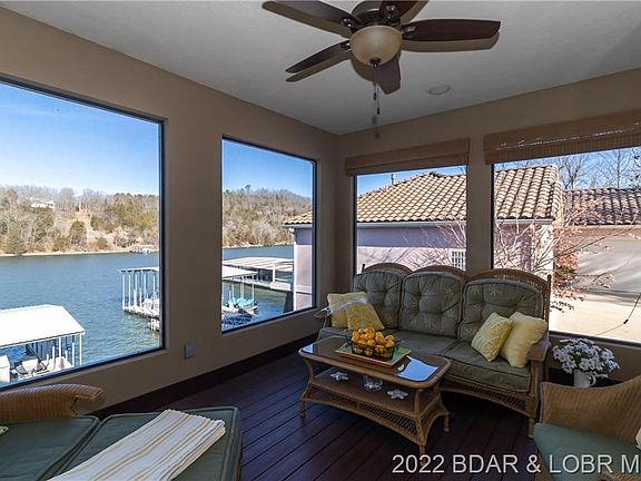 Check out this like new home in the gated subdivision of South Beach. When you enter this spacious home you are met with a wall of windows lakeside to take in that gorgeous view of the Lake of the Ozarks. It's an open concept floor plan with main level living and travertine tile and custom knotty alder Cabinents throughout. Right off the kitchen is a large screened in porch with an open walkway on the side perfect for grilling. The master bedroom is right off the living room and has a private balcony, the bathroom has his and her vanities, walk in shower as well as a huge walk in closet with washer/dryer hookups. Walk downstairs to the 2nd living area as well as the 3 guest rooms and wet bar. Outside there is a huge concrete patio, perfect for entertaining and soaking in that view while listing to the peaceful waterfall. There are very few steps to your concrete 3 well dock with swim platform and 2 sheds and fish cleaning sink which is located in a wide peaceful cove.