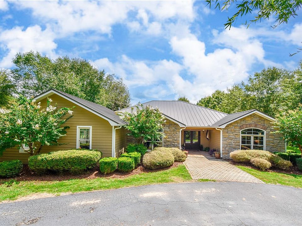 This beautiful country estate sits on 50+/- acres, fenced, partially wooded w/ multiple pastures. The wrought iron gated entrance leads you down a long picturesque driveway as you make your way to the main house. The main house offers heated/cooled double garage, open concept floorplan, spacious family room, large kitchen, keeping room, oversized laundry w/ tons of storage & sink, walk in pantry, 3 large bedrooms, 2.5 baths & an office. This home has no steps making it easy for all ages & has a whole house generator, new standing seam roof & an electric car plug. Check out the newly built barndominium constructed using reclaimed wood & pallet wood from Italy. The barndo has 2 central heat/air units, plumbed for propane & has a tankless hot water heater. The upstairs living quarters are stunning providing beautiful views of the property. Downstairs the 12 ft wide doors will allow for a tractor to pull all the way through & has 4 attached horse stalls & covered side carport.