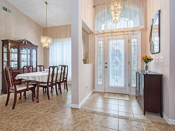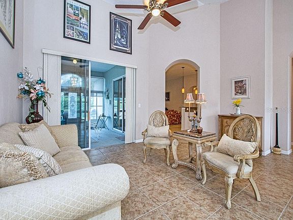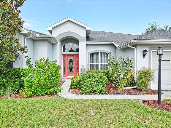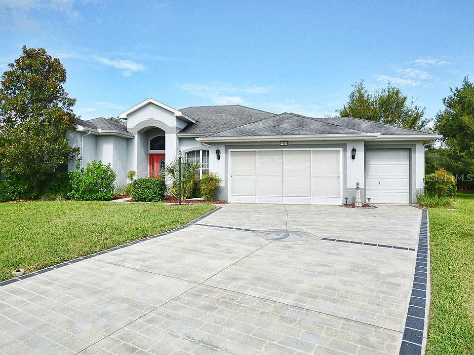 Beautiful & Custom Designed "St Andrews" model home with grace and elegance throughout can now be yours. Oversized lot includes fabulous 20x28 3 car garage and plenty of room to breathe. Enter this special home to find vaulted ceiling in Living Room as well as 8' sliding glass door leading onto 27x16 screened lanai with sliding windows and solar shades. Dining Room just off Foyer is welcoming in front of large window. Step into Kitchen which is open to Family Room and sunny Breakfast Nook overlooking large lanai. Kitchen is large and includes 42" cabinets, pull-outs, copious counter space, Corian counters, stainless appliances with double oven! Family Room with beautiful wood laminate includes welcoming & cozy gas fireplace. Bedrooms 2 & 3 include large closets and share Guest Bath w linen closet, raise Corian vanity and shower with sliders. Laundry Room is off Kitchen and feature Washer, Dry Clean Dryer, laundry sink and storage. Master Suite is lovely with tile floors, French doors onto lanai, 2 walk-in closets and 'ensuite Bath. Oversized Master Bath with Roman shower, linen closet, dual Corian raised vanities and relaxing soaking tub. There's more... Double Pane Windows & Sliders, Tubes In The Wall Pest Defense, Alarm System, painted garage floor, garage screen front & new AC compressor 2017! "St Andrews" home is a pleasure to reside with easy flow throughout and split sleeping quarters guarantees privacy for you & guests. "Royal Harbor" 55+ on The Harris Chain of Lakes would like to welcome you home...
