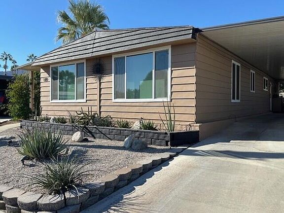 Million Dollar Views from Open Concept Living Room, Dining Room and Kitchen ! Extra Large Mountain/Sunrise View Picture Windows in living room boast morning and evening views! This Beautifully upgraded home is Open, Airy and Light filled.Glass slider doors in Dining area open up to a large covered patio and one of the largest fenced-in yards in the community, including a brand new metal roof Gazebo and new Trex fencing, great area for entertaining and pets! Kitchen has lots of storage, pantry, new Stainless French Door Refrigerator, Wall Oven/Microwave combo, 5 burner cooktop, and designer backsplash. Stunning lighting over 2 separate eating areas! Easy care Vinyl Plank Floors Though-out home. Separate Laundry Room with lots of storage, washer/dryer included. Both Bathrooms have newer Walk-in Showers with handrails and pull down seats. Upgraded faucets, handles, & Medicine Cabinets. New round accent mirror and designer Wallpaper. Master Bathroom is extra large with double sinks, linen closet and Laundry Hamper. 2-car Carport with double sized Shed w/ electricity and Cabinets. Indian Springs Mobile Home Park is a quiet and beautifully maintained Community with Greenbelts, heated Pool, Spa & Clubhouse. 360 degree Mountain views make it feel like an exclusive Resort! Located only 5 minutes from The Fabulous El Paseo Shopping & Dining District and The Living Desert Zoo! Indian Springs is a privately owned Park ( not Indian Land ) the Space rent of this home is only $720 a month and is under Rent Control and has no Land Taxes ! An Amazing Lifestyle with Beauty at a Bargain awaits you!