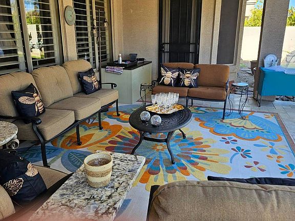 Southwest Living at its best. Tuscan/Santa Barbara style home in a gated adult focused community. Low maintainance 9,000 sq. ft. fully fenced lot. Six ft. block wall stucco surfaced fence for privacy. Private salt water pool that is heated and cooled with new (2021) pool equipment. Large covered patio and large gazebo, lots of stone pavers. All plants on auto timer, Synthetic grass, crushed granite yard with mature lemon tree. Three car garage with built in cabinets. KITCHEN: Granite Counter Tops KitchenAid Dishwasher KitchenAid Double Oven KitchenAid Stove Top (gas) KitchenAid Microwave oven KitchenAid Refridgerator Reverse Osmosis Water System Kitchen Island Pull out drawers in cabinets Soft close custom cabinets Laundry Room with comercial sink Large open pantry Great Room: Gas Fireplace with Stack Stone Facing Built in cabinets and shelves Custom lightings Upgraded Ceiling Fans 2 1/2 Bathrooms: All toilets are ADA compliant Grab bars in all bathrooms All toilets have bidet toilet seats Master suite bath has Ella "Ultimate" Inward Swing Door Walk in Bathtub Double sinks. Custom upgraded shower in master suite Master suite has upgraded ceiling fan Walk in Closet Custom 24"X24" ceramic tile 9 ft. Ceilings throughout Security Screens on all doors Sun Screens on Windows Plantation Shutters throughout Zero-Grade Entry Hallways 36" Wide Community Features: Gated Community Biking/Walking Path Club House Ball Room Media Room Pickle Ball Courts Tennis Courts Basketball Hoops Two Community Pools Community Spa Community Media Room Concierge Fitness Center Golf Course Green Open Spaces Ramada's throughout the community