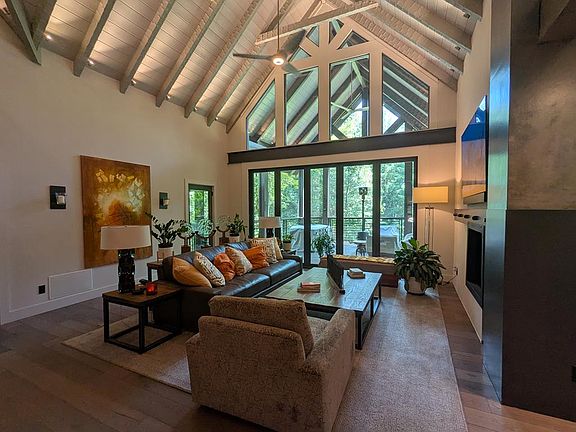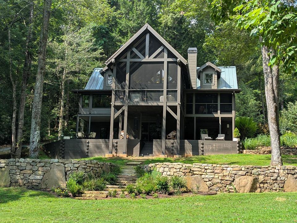 Remodeled Modern Mountain Luxury located on East Mountaintown Creek with Six Private Acres. This cabin was redesigned by famed architect Bill Harrison of Atlanta. The construction remodel was completed by the award winning Atlanta Dernehl Company. The interior is contemporary but classic with industrial accents. Kitchen is spacious and perfect for entertaining with elegant but rugged quartzite countertops, two sinks, and Wi-Fi enabled Jenn-Air appliances, Directly off the kitchen is a sunroom with a double sided fireplace, and large windows to showcase the landscape particularly the flowing creek, mature trees, well kept gardens, mountains, and pasture, Folding glass doors in the great room disappear to create a sprawling indoor-outdoor living space that flows directly onto the deck. The deck features a dining table and comfortable seating, perfect for hosting guests. Another secluded porch is tucked away with a wood burning fireplace off the primary bedroom on the main. Upstairs there is an open loft perfect for an office between two guest bedrooms and a shared bathroom. Illuminated trees line this spectacular track, which is set against beautifully landscaped grounds. A colonial styled garden is also on the property featuring benches, inviting walkways and a variety of fruit trees. There is a potting shed, a former poultry parlor, and several other discretely located outbuildings. The expansive unfinished basement is stubbed for plumbing and ready to be finished if Buyer wishes to expand. Smart House with Generator. Home is wired for remote monitoring.