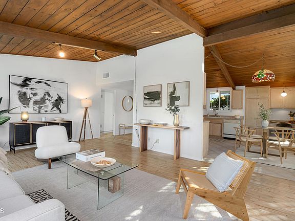 Nestled on a peaceful flat cul-de-sac south of Ventura Boulevard, this mid-century modern retreat with a pool, blends indoor/outdoor living, energy efficiency, and a coveted Woodland Hills lifestyle. The open floor plan showcases exposed wood beam ceilings, airy volumes, and a seamless connection to the outdoors through multiple sliding glass doors leading to the pool, multiple patios, and private yard, creating the ideal setting for relaxed living and effortless entertaining. The kitchen, living, and dining areas flow seamlessly, oriented toward the sparkling pool and side dining patio for year-round enjoyment of California's indoor-outdoor lifestyle. Owned and paid-off solar panels (installed 2022), a newer roof (2022), EV charger, tankless water heater (2024), newer HVAC system (2022), upgraded insulation and ducting, 200-amp panel, and updated plumbing and windows provide modern efficiency and peace of mind while preserving the home's special architectural character. Featuring 4 bedrooms and 1.75 baths, including a spa-like remodeled Jack & Jill marble tile finished bath, the home offers flexible living spaces ideal for today's lifestyle needs whether it be creative workspace, a wellness room, or guest accommodations. Multiple access points to the yard and pool from the main living areas and bedrooms enhance the home's resort-style feel. Conveniently located near Woodland Hills' favorite local hotspots, it is minutes to Bristol Farms, Starbucks, Handel's Ice Cream, boutique fitness studios, and both trendy and legendary dining spots along Ventura Boulevard. The Commons at Calabasas, multiple shopping destinations, hiking trails, and weekend farmers' markets are all nearby, providing an array of lifestyle amenities just moments from home. Situated on an 8,646 sq ft lot, and first time on the market in nearly 30 years, this is a rare opportunity to own a pool home with architectural charm, energy-smart features, and a quiet, tucked-away setting close to everything that makes Woodland Hills one of the most desirable communities in the Valley.