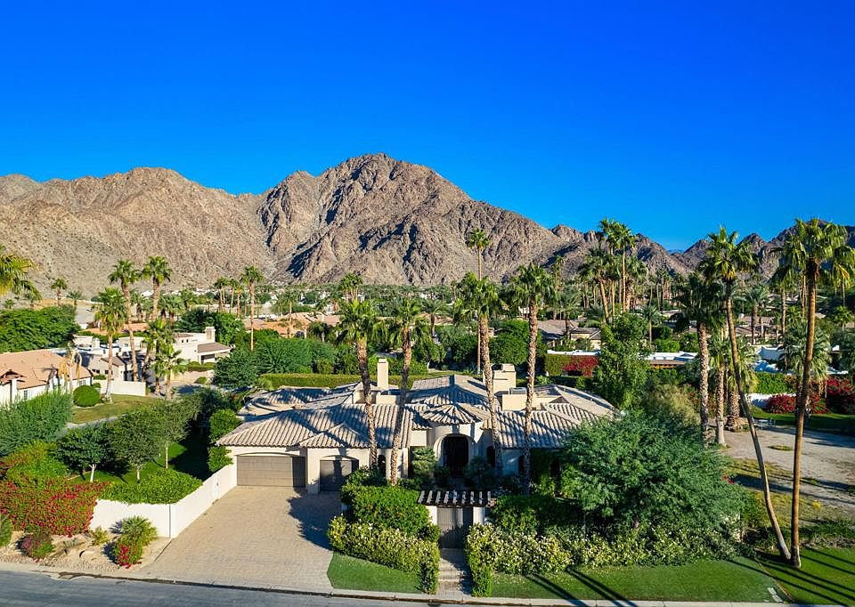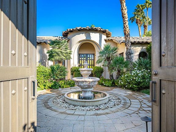 Luxury custom estate with all the amenities at La Quinta Country Club Golf Estates. Enter this very private enclave with sparkling fountain in the courtyard. 5BBR/5BA spacious home with 4 en suite bedrooms and powder bath in the main house, plus casita. This luxury home is made for entertaining with pocket doors for indoor/outdoor living. Open livable floor plan with high ceilings, stone flooring, chefs kitchen, large dining room, step down bar, fireplaces in living room, den, master. Outdoor entertaining Palapa bar outfitted with grill, refrigerator, and seating. Relax in comfy outdoor seating with mountain views poolside and putting green to hone your skills. Set on an ample 15,246sq.ft lot, with side yards and beautifully landscaped side yards. An entertainers dream home- come take a private tour!