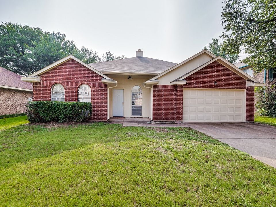 One story home close to highway 360 and all the conveniences! Hard surface flooring throughout entire home with beautiful laminate wood floors and ceramic tile. The large living area has a 13' vaulted ceiling that really opens up the space, includes wet bar and cozy wood burning fireplace with decorative mantle and stack stone surround. Kitchen has breakfast bar for additional seating, pantry, a breakfast area with window seat at the end of the kitchen and refrigerator stays. Primary bathroom has walk-in closet with built-in shelves, dual sinks, garden tub and separate shower. Bedroom 2 has walk-in closet and direct access to second full bath. Bedroom 3 is spilt at front of home. Flex space off entry has pass through window to wet bar, this space could be additional living area, dining room or home office. Backyard offers plenty of room for kids and dog to play as well as a storage shed. Water heater replaced in 2020. Exterior just painted, new entry and rear doors! No HOA.