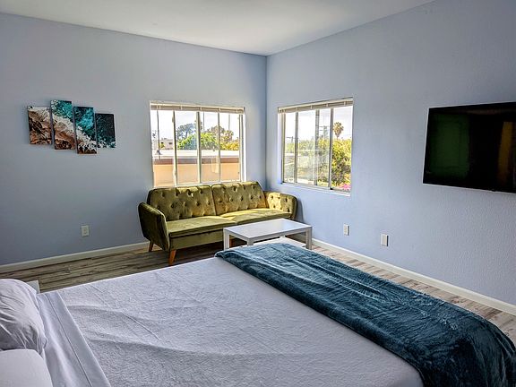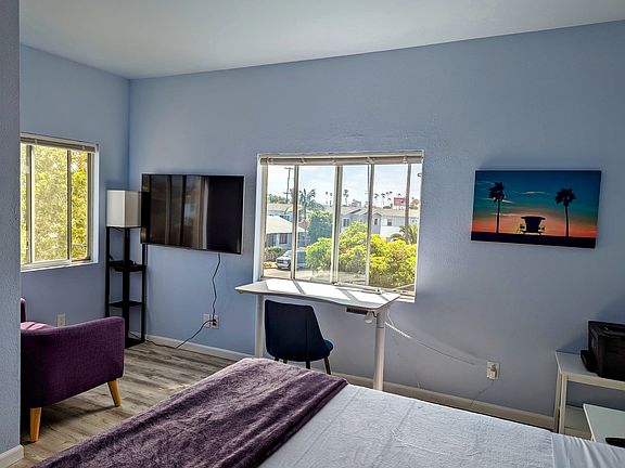 Available furnished or unfurnished. Flexible leases available! 3 bedroom, 2 bath apartment located just 2 1/2 blocks from dog beach and a short walk from some of San Diego's best food, beer, and beach life. Located on a property that backs up to Robb Field Park. The sunsets here are gorgeous and the real star of the show. The SeaWorld fireworks are even viewable from the green bedroom. This is a great space for dogs, families, students, and remote working professionals. Each room has a color theme. The master bedroom has purple accents with a queen bed and its own private bath. The orange room has a queen on queen bunk bed. The green room is the largest bedroom, it has a queen bed and views of the ocean, bay, park, and SeaWorld Fireworks. There are three 55" UHD TVs, each on a swivel mount to be viewed from anywhere in the room. There are two motorized sit/stand desks, one in the purple room and one in the green room. Shared laundry room and hot tub.