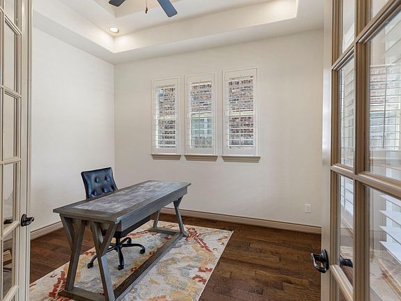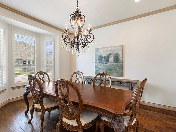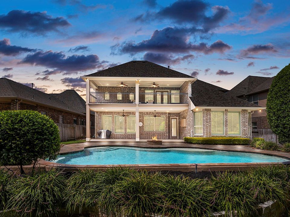 The elegant brick and stone facade welcomes you to a charming front porch entry. Inside, find beautiful wood floors and plantation shutters throughout, with an office and formal dining space gracefully flanking the entrance. A spacious kitchen boasting a center island, abundant cabinet space, upper and under cabinet lighting, gas cooktop, dual ovens, butler's pantry, breakfast bar, and pantry with custom Elfa shelving. The kitchen flows seamlessly into the family room, anchored by a cozy gas fireplace. The primary bedroom offers views of the sparkling pool and reserve, while the ensuite offers dual sinks, whirlpool tub, separate shower, and walk-in closet with custom cabinetry. Upstairs is a large game room, media room, and three additional bedrooms. Outside discover a heated and chilled pool, firepit, and expansive covered patio. Premium features include water filtration system, tankless water heater, roof replaced in 2021, and fresh exterior paint from 2023.