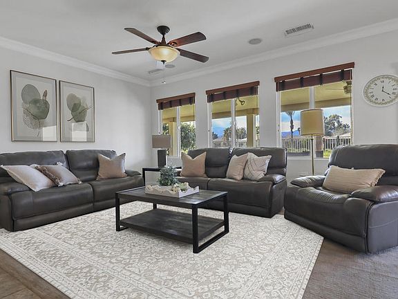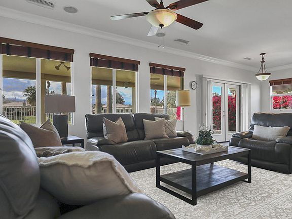 This beautiful 4-bedroom, 3.5-bath, 3-car garage home is in the exclusive Indian Palms Country Club, known for its tranquil atmosphere and resort-style amenities. Enjoy breathtaking sunsets and stunning mountain views from this west-facing home. The main living space seamlessly blends indoor and outdoor living with beautiful French doors that open to a remarkable 50-foot covered patio. This expansive outdoor area is equipped with electronic sunscreens, perfect for year-round entertaining, dining, or relaxing. The interior features custom upgrades, including elegant crown molding and upgraded light fixtures. The detached casita with its private entranceoffers endless possibilities, such as a guest suite, home office, art studio, orworkout room. Beyond the home, the Indian Palms community offers an exceptional lifestyle. Low HOA dues grant access to three swimming pools, a state-of- the-art workout facility, and well-maintained tennis and pickleball courts Indio's rental-friendly policies make this property an outstanding investment. Discover the perfect blend of luxury, privacy, and flexibility in this one-of-a-kind home. Schedule your private showing today. Disclaimer: Some pictures have been virtually staged or enhanced.