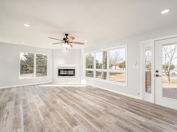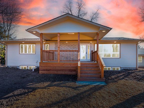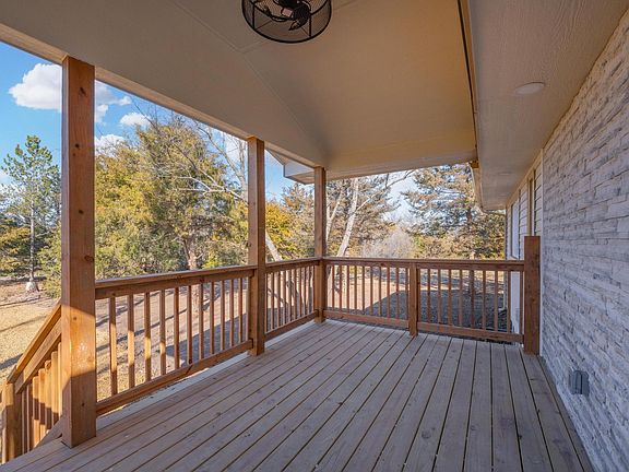 Introducing a serene country retreat that seamlessly blends modern comforts with country charm. This raised ranch home, situated on 4.3 acres of lush land adorned with mature trees, offers breathtaking panoramic views of expansive farmland, providing a tranquil and picturesque setting. Key Features: Spacious Living: The main residence boasts 5 bedrooms and 3 full bathrooms, complemented by an oversized 2-car garage. An additional expansive workshop includes its own full bathroom, bringing the total to 4 bathrooms. Inviting Entrance: Arrive via a circular driveway leading to a welcoming 10x16 front porch. Elevated to capture calming vistas, the porch is equipped with a remote-controlled ceiling fan and dimmable recessed lighting, creating an ideal space for relaxation. Open-Concept Living Area: Step inside to an open floor plan featuring a cozy living room with a beautiful fireplace and adjustable can lighting, seamlessly flowing into a newly renovated kitchen. The kitchen is a culinary enthusiast's dream, featuring a large granite-topped island and bar, new appliances—including a French door refrigerator with ice and water dispenser, a convection stove with built-in air fryer and steam cleaning, microwave, dishwasher with stainless steel tub, and garbage disposal. A walk-in pantry offers ample storage and can double as a main floor laundry room if preferred over the basement laundry area. Finished Basement: The lower level presents a spacious family room with a fireplace, dimmable recessed lighting, and wall outlets designed for mounted TVs. Adjacent are a media/game room, bathroom, 2 bedrooms, dedicated laundry room, storage room, utility room, and a charming bonus "Harry Potter" room. Outdoor Living: The backyard features a massive two-tiered deck measuring 19x30, perfect for entertaining or enjoying peaceful moments. There is a fence. Expansive Workshop: A substantial 24x50 outbuilding serves as a versatile workshop, complete with a 6x20 covered porch ideal for enjoying rainy days. The building is equipped with its own 220 electrical panel, numerous outlets, water tank, central heating and air conditioning, abundant natural light complemented by fluorescent lighting, and multiple windows to invite fresh air. French doors facilitate the entry of large items. The workshop also includes a full bathroom, utility sink, floor drain in the garage area, insulated garage doors, and its own septic system with a newly installed tank. This property truly encompasses all the desirable features for comfortable and luxurious country living. Don't miss the opportunity to make this exceptional home your own. Licensed broker in the state of Kansas has interest in property.