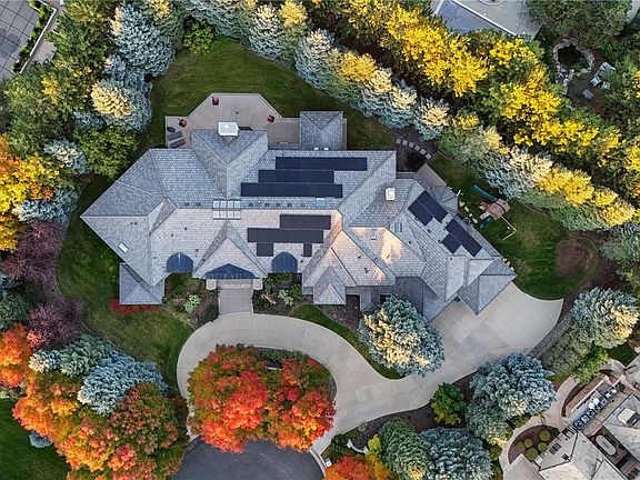 Additional highlights include an attached apartment with private entrance and full kitchen, two home offices, upper-level fitness studio with ensuite bath, finished lower level with game room, art room, and abundant storage. A Savant smart-home system, automated shades, nine heating/cooling zones, owned solar panels offsetting 140% of energy costs, and advanced security with cameras enhance the property.