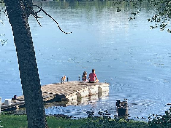 Charming 2-story home w/ Shady Oak lakeshore. Footpath to own swimming beach. Hilltop homesite features east-facing Sunroom w/distance views. Main Floor BR features 3/4BA & could be a Main Floor Family Room or Home Office & walk-out to large Deck